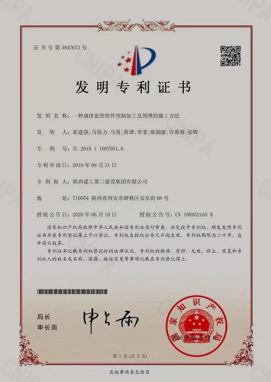 近日,集團公司設備安裝公司申報的QC成果《無甲醛消音復合風管內置方法的創新》榮獲國家級QC二等獎;申報的《一種成排套管組件預制加工及預埋的施工方法》,獲得國家級發明專利
