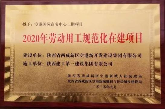 9月28日下午,西咸新區空港新城人社局、城建局在空港新城保稅區自貿大都匯四樓多功能廳召開2020年勞動用工規范化在建項目表彰大會,由集團第三工程公司承建的空港商務二期項目榮獲“2020年勞動用工規范化在建項目”,項目勞資員賀疆葉榮獲“先進個人”。